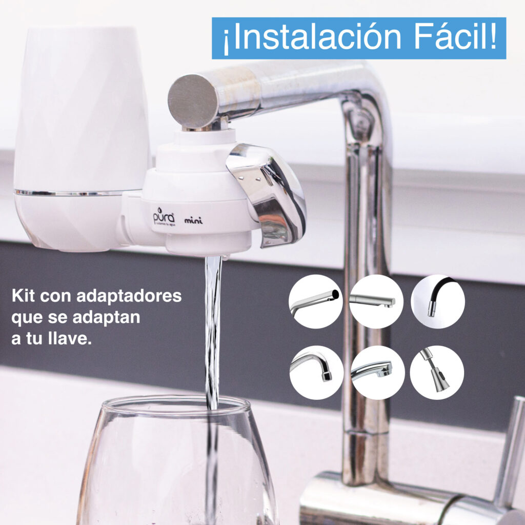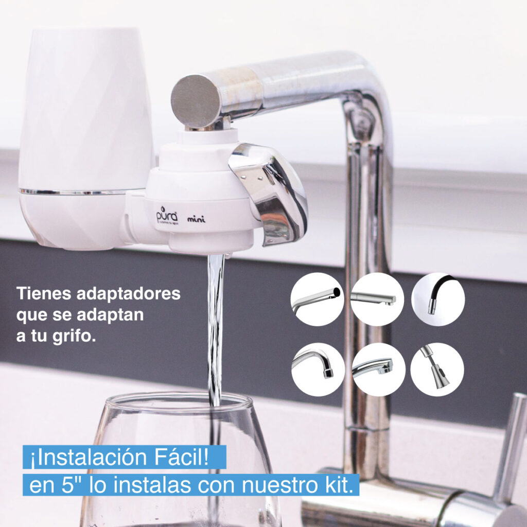El PURA Mini es altamente compatible con todos los grifos, incluyendo llaves monomando, llaves estándar de cocina, llaves extensibles y lavaderos. Incluye un kit completo de adaptadores y accesorios que garantizan una conexión rápida, fácil y segura. No requiere herramientas, perforaciones ni modificaciones. En pocos minutos tendrás agua PURA directamente desde tu grifo.