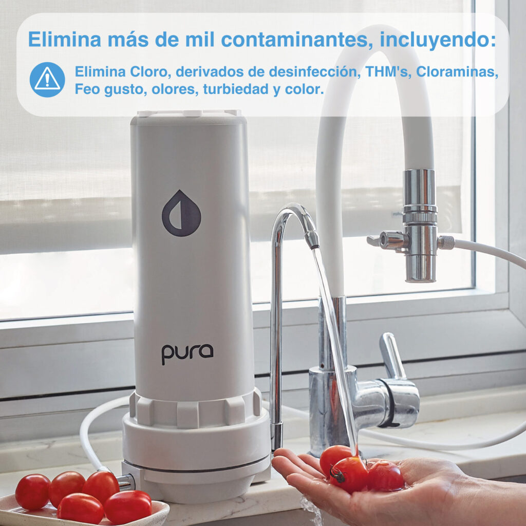 Cada Purificador PURA® utiliza tecnología propia y patentada que elimina con el mayor rendimiento, presión y caudal el 99.9% de Cloro, feo gusto y olores extraños, sustancias químicas derivados del Cloro, cloraminas, trihalometanos, compuestos orgánicos volátiles, restos de agroquímicos, sedimentos, elimina microbios, quistes bacterianos, pirógenos, bacterias inactivas, parásitos, arenillas, turbidez e impurezas. También elimina micoplásticos, BPAs, PFAS y otros contaminantes emergentes que pueden estar presentes en las redes de agua.
